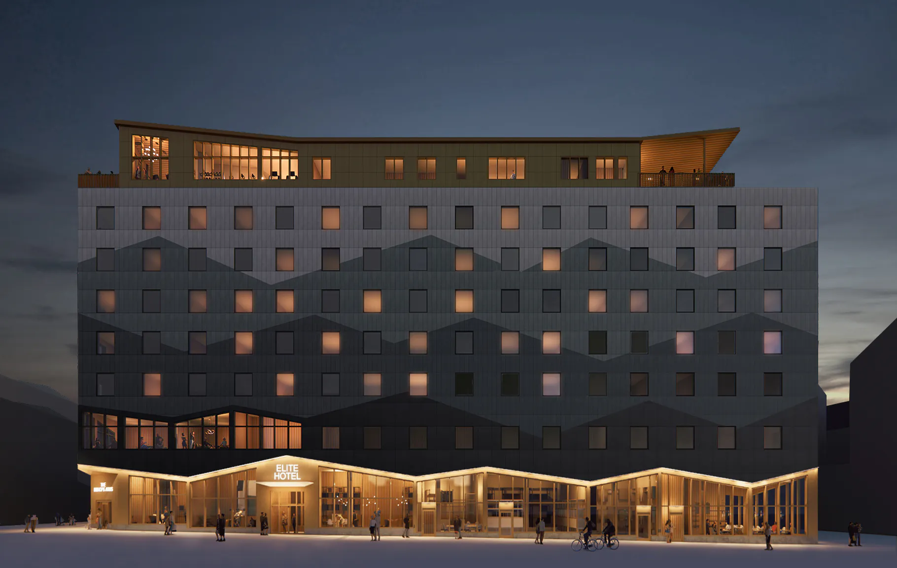 Byggnadens fasad har ett mönster inspirerat av det kringliggande fjällandskapets vyer, med fjäll på olika avstånd i blågröna nyanser. Entréplanet och översta våningen som är de mest publika delarna är generöst uppglasade och utförs i varmare träkulörer och en guldfärgad metall. Från skybar och rooftop spa kan besökaren njuta av Kirunas unika midnattssol och norrsken.